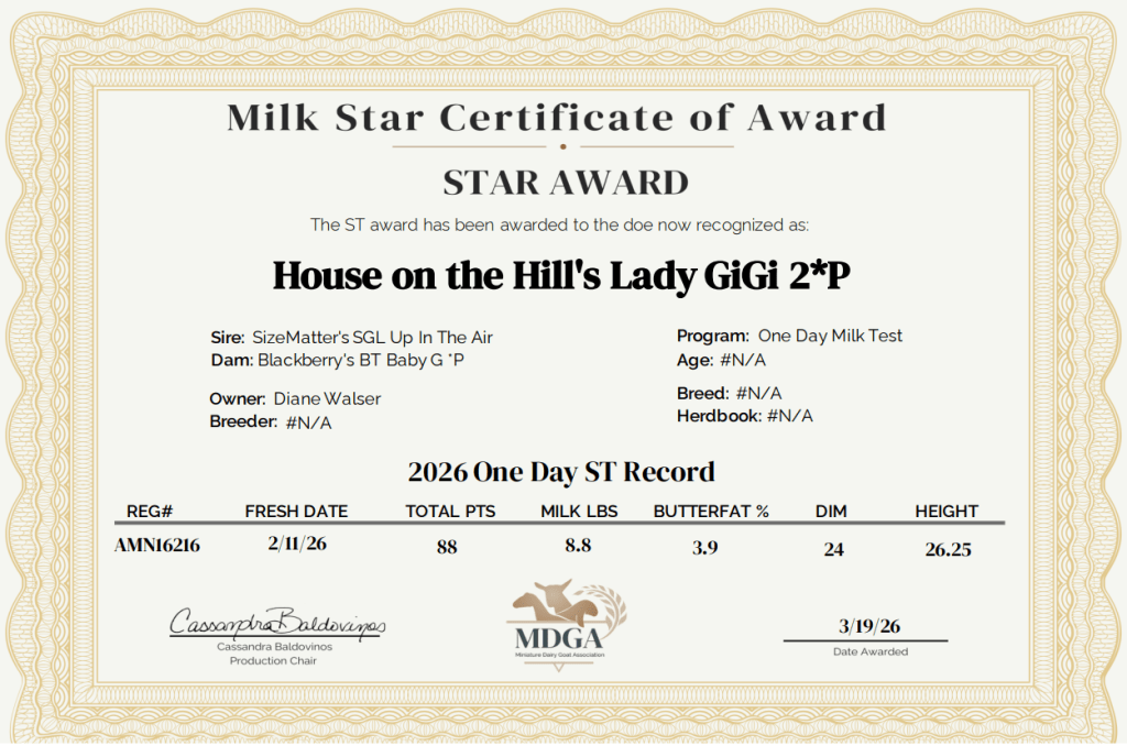 She is producing over a gallon a day. Her udder is one of my favorite in our barn. It is so soft with wide orifices and super easy to hand milk. She has perfect lateral attachments and good height. Her fore udder is very smooth. Congratulations to Gigi on earning her one day star!